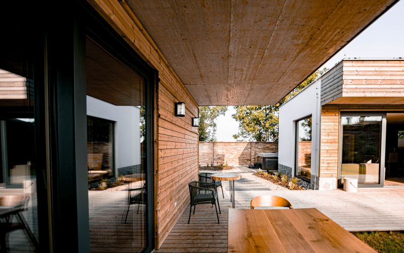 Protože jsou Novotní velcí milovníci přírody, rozhodli se použít pouze přírodní materiály jako dřevo, sklo a kámen a držet se příjemného minimalismu. „Snažíme se respektovat přírodu a našim klientům přinést kousek z ní i do prožitku z relaxu. V celém areálu najdete převážně materiály z České republiky. Hlavně pak dřevo, které je pro nás symbolem klidu a čistoty." A opravdu to funguje. Jakmile vkročíte do zahrady, ucítíte spojení s přírodou a v mžiku zapomenete na všechny svoje starosti.