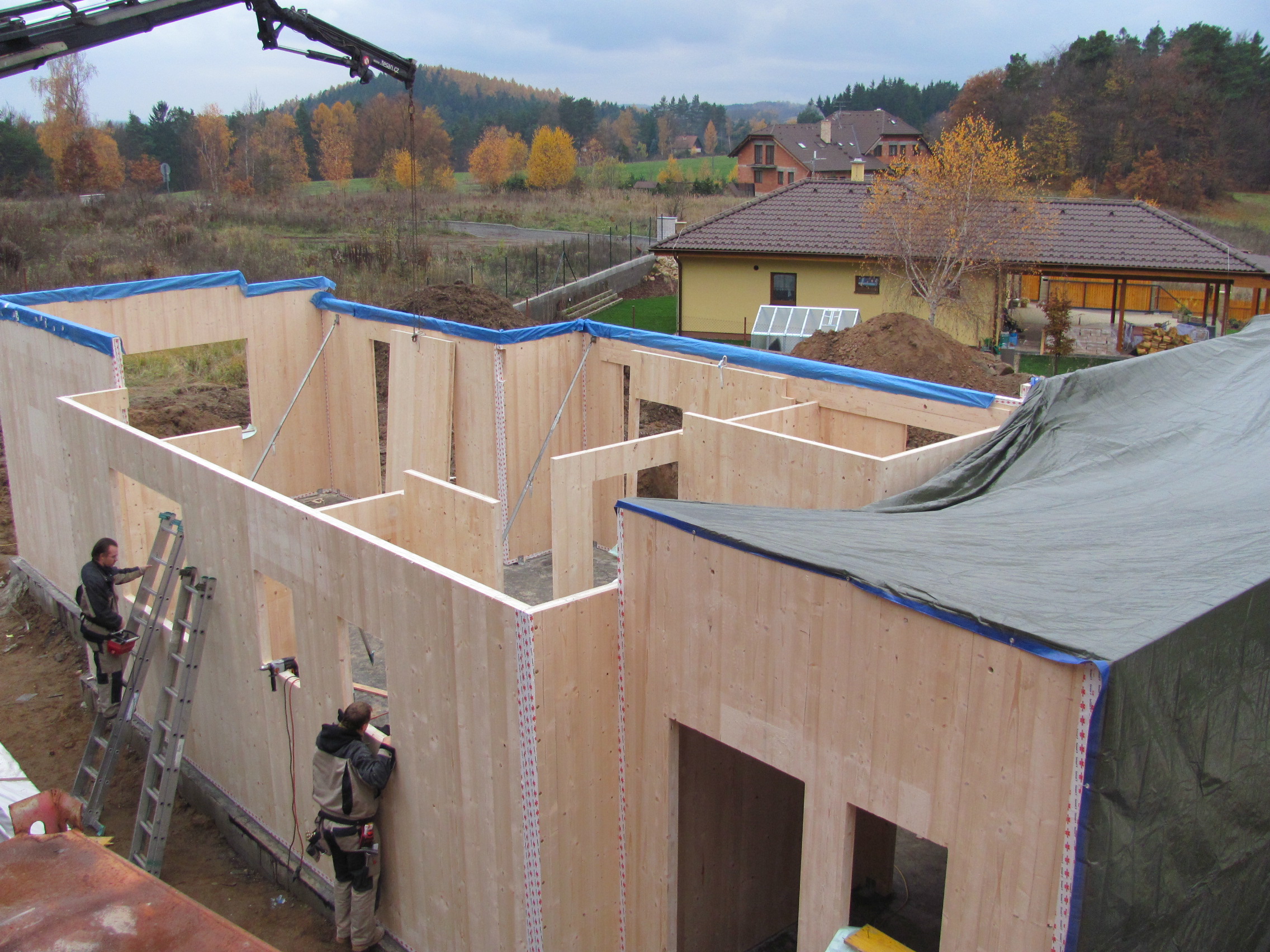 - Prohlídka rozestavěného domu z masivních dřevěných panelů ve fázi po montáži oken