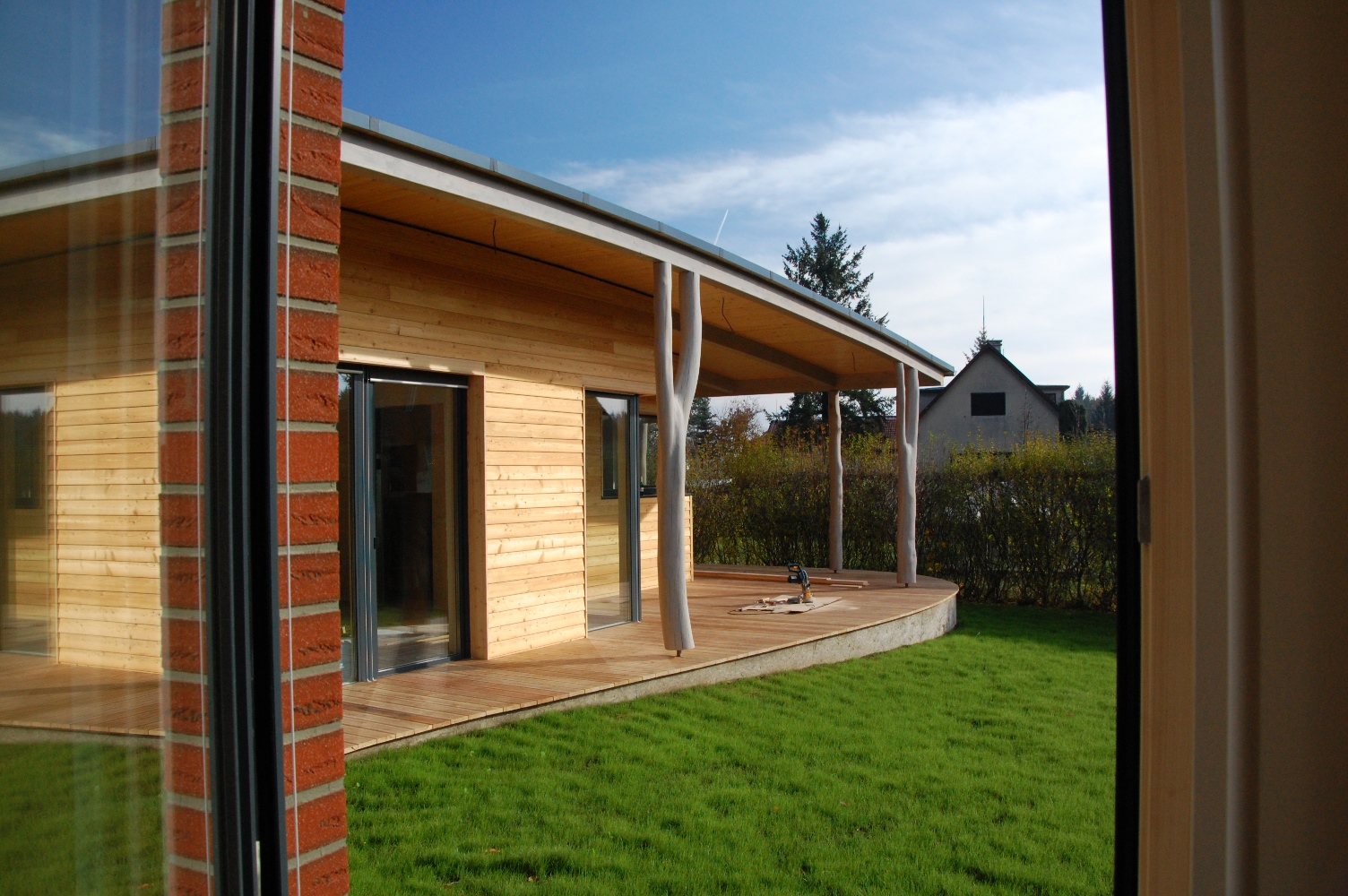 - Prohlídka dokončeného domu inspirovaného lesem z masivních dřevěných panelů