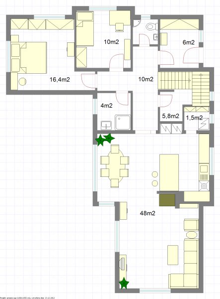 Díky zajímavému dispozičnímu řešení najdete v přízemí plně vybavený 3+kk. Patro pak nabízí dětěm prostor pro hry i soukromí – 2 dětské pokoje (možno řešit i jako 1 velký spojený prostor) a koupelna s vanou. Prostorná terasa, která je přístupná z obýváku, ložnice i koupelny a je zčásti zastřešená výraznými přesahy střechy, zvětšuje v letních měsících obytnou zónu směrem do zahrady.