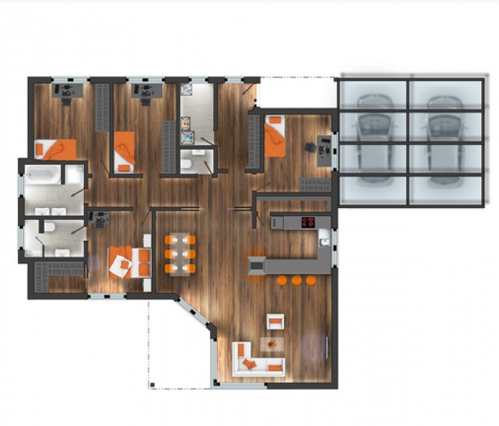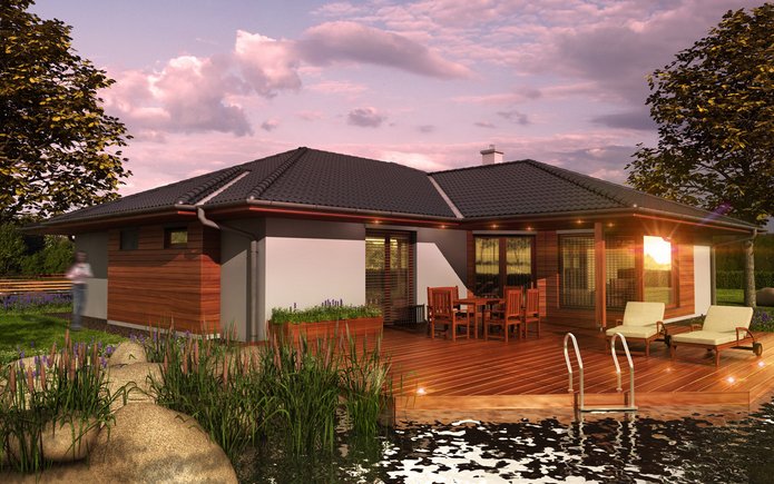 Jednopodlažní bezbariérový dům nabízí na užitné ploše 141 m2 komfortní jednogenerační zázemí - dispozici 5+kk, pro čtyř- až pětičlennou rodinu.