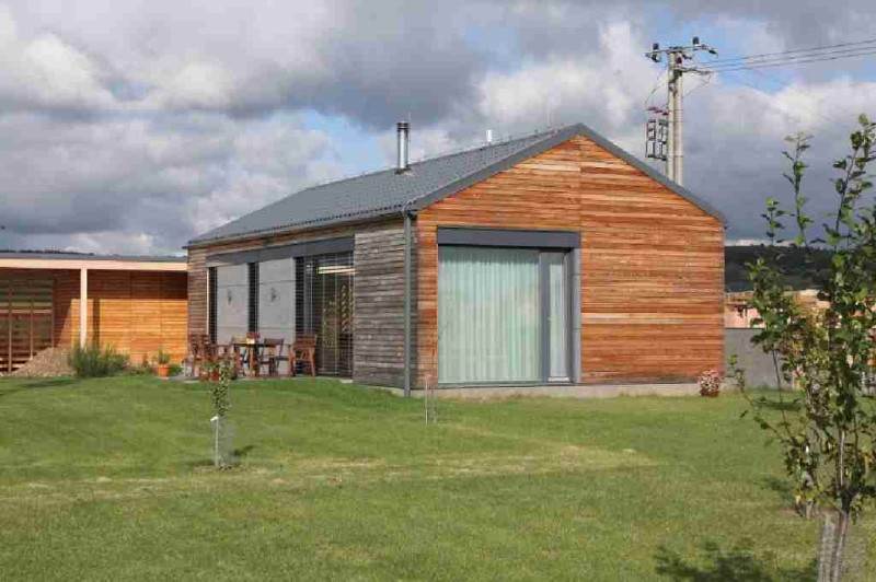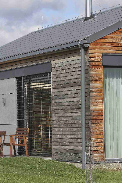 Jednoduchost nejen ve tvaru, ale také v barevnosti, tak by se dal popsat tento dům. Moderní rodinný dům, kterému dominují přírodní tóny použitých materiálů. Obvodové stěny včetně štítu z dřevěných prken jsou velmi vkusně zkombinovány s decentní tmavošedou barvou okapového systému Lindab Rainline a střešní krytiny Lindab Topline LPA. Stejný odstín tmavě šedé barvy byl také zvolen pro okenní rámy a venkovní žaluzie. Čisté linie okapového systému Lindab Rainline nenarušuji jednoduchost stavby a společně s krytinou tvoří kompaktní celek.
