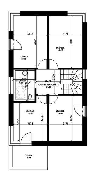 V patře rodinného domu je vytvořený prostor pro 4 ložnice a koupelnu. Dispozice druhého patra lze upravit podle potřeb tak, aby spojením dvou menších ložnic vznikla jedna ložnice velká. Nově vzniklou velkou ložnici je možné dispozičně poupravit a vytvořit šatnu, nebo zvětšit koupelnu.
