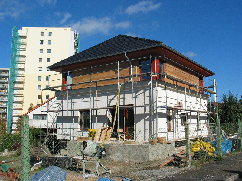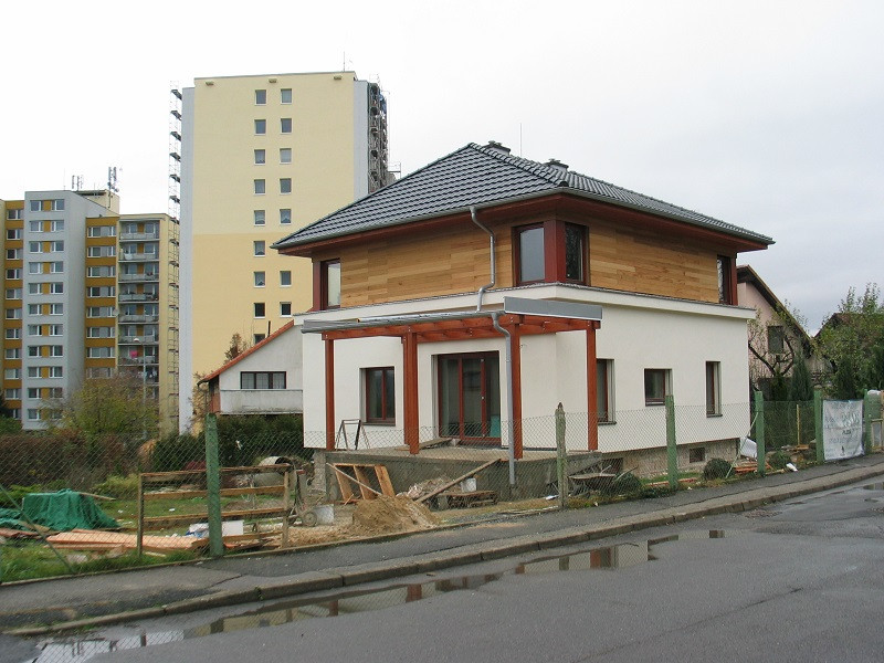 Po osazení otvorových výplní byl proveden fasádní obklad z cedrových palubek a zateplovací plášť se silikátovou omítkou na minerální vatě.