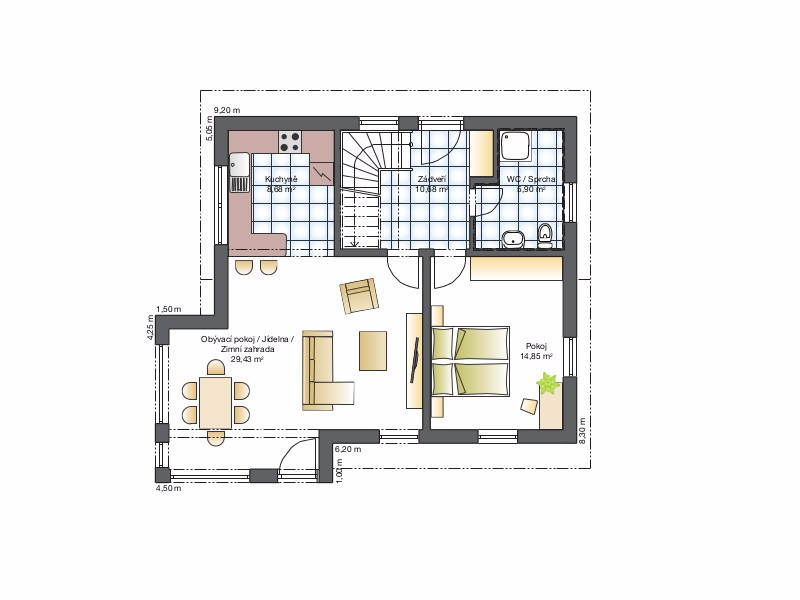 Architekti Haas Fertigbau vybrali ze stavebnice Symphony pro nový dům Spring půdorys 8,30 x 9,20 + zimní zahrada, který ponechává i na menších pozemcích prostor pro zahradu, ale ne na úkor užitné plochy - ta má velikost až 126 m2. V rámci akční ceny obdrží zákazník kromě dispozice 5 + kk i zimní zahradu s plochou střechou a velkými prosklenými plochami. Dům Spring pamatuje také na nízkou energetickou náročnost - stěny Thermo-Protect® Premium mají součinitel prostupu tepla U pouze 0,14 W m2 / K a okna jsou osazeny izolačním trojsklem. Příznivce praktického bydlení potěší komfortní využitelnost celého podkroví.