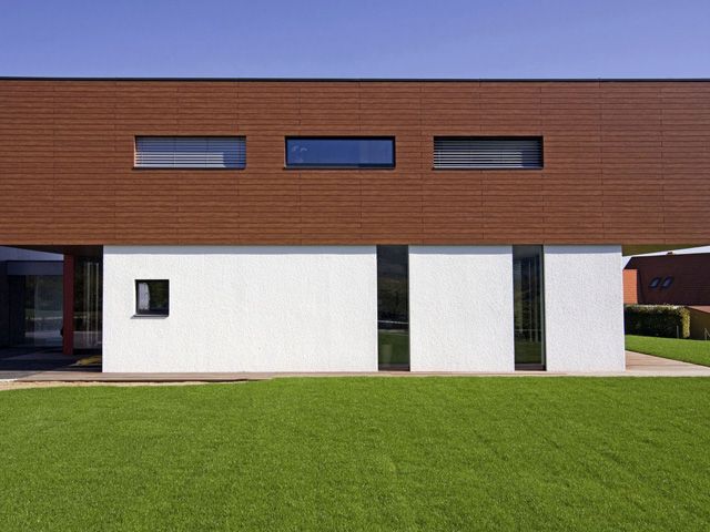 Ztvárnění fasády kombinuje hrubě strukturovanou bílou omítku a obklad tmavým dřevem, takže vzniká poměrně dramatický, ale zároveň harmonický kontrast. Omítka je opatřena nátěrem barvou StoColor, která má samočisticí efekt, takže zůstane dlouho jasně bílá. Ekologický koncept završují použité materiály – dřevo, izolace celulózou, sklo a přírodní kámen. Celý dům včetně přízemí je konstruován jako dřevostavba: součástí vnějšího pláště je fasádní zateplovací systém Sto Therm Wood, který díky vláknům z měkkých dřevin šetří nejen energii nutnou k vytápění, ale také jiné než dorůstající suroviny.