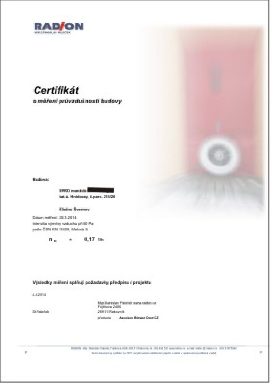 Projekční firma ARCHCON atelier a realizační firma Dřevostavby Biskup se těší ze skvělého výsledku, který dosáhl jejich pasivní dům v Kladně, jenž na výbornou prošel testem průvzdušnosti. Test se zpravidla provádí, aby potvrdil měřítko kvality budovy a její energetickou náročnost – laicky řečeno, čím menší průvzdušnost obálky budovy, tím menší úniky tepla. Protokol o zkoušce je nutné doložit pro získání dotace v programu Nová Zelená Úsporám, kde je nutné doložit snížení průvzdušnosti obálkybudovy na hodnotu definovanou výměnou vzduchu za tlakového rozdílu 50 Pa n50