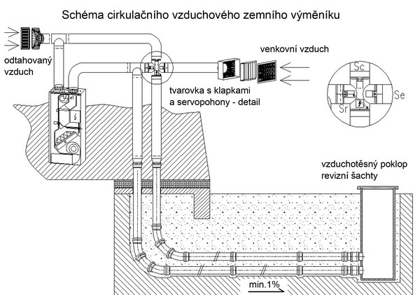 Samostatnou částí, kterou je možné doplnit do systému nuceného větrání, je zemní výměník tepla. Jedná se o potrubí uložené v zemi, přes které větrací jednotka nasává čerstvý vzduch a tím ho v letním období předchlazuje nebo v zimě předehřívá. Vzduch se tak při venkovní teplotě 32 stupňů ochlazuje na teplotu 18 až 22 stupňů. V zimním období naopak zemní výměník slouží jako protimrazová ochrana rekuperačního výměníku: z teploty - 15 stupňů se přiváděný vzduch předehřívá na teplotu kolem nuly. Výsledné teploty předhřevu a předchlazení jsou ovšem závislé na délce potrubí a jeho výkon zase na množství přiváděného vzduchu. Výkon zemního výměníku tepla však nelze přeceňovat. Při 300 m3 přiváděného vzduchu je chladicí výkon takového systému asi 900 W a jedno nezastíněné jižní okno nám jeho účinek eliminuje.