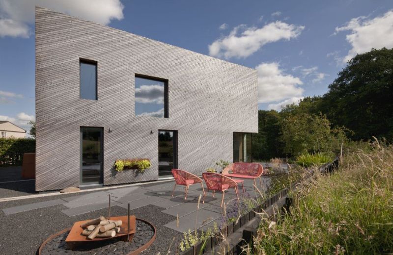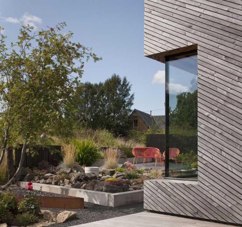 Vlastníma rukama se Mhairi a Martin postarali také o drenáž základové desky, instalaci dřevěného obkladu, terénní úpravy a zelenou střechu. Kratší seznam tvoří práce, na které si najali řemeslníky – výkop a příprava staveniště, vylití desky, osazení oken, izolace střechy, omítky, elektronistalace a instalace fotovoltaického a solárního systému. Výsledkem šestiletého procesu pečlivého plánování, pozorného výběru materiálů a obrovského podílu ruční práce je neotřelý certifikovaný pasivní dům jednoduchého tvaru s prvky skandinávské architektury.
