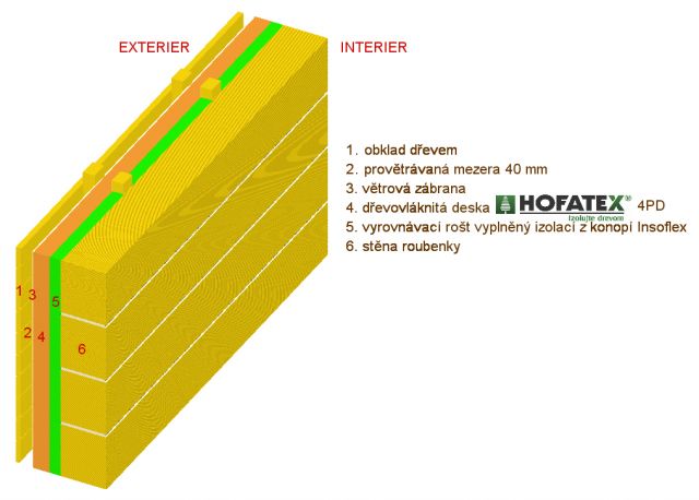 Venkovní povrch roubené stěny se opatří svislým roštem, který současně vyrovná povrchové nerovnosti stěny. Mezi latě roštu se vloží pružné izolace z konopí Insoflex. Potom se na rošt pomocí vrutů upevní desky Hofatex (po obvodě napojené na dvojité pero a drážku). Na závěr se zvenčí provede dřevěný provětrávaný obklad, který může imitovat původní vzhled roubenky. Tímto způsobem lze běžně dosáhnout požadovaných, resp. doporučených hodnot součinitele prostupu tepla. Zateplení srubových stěn zvenčí je po stavebně-fyzikální stránce jednoznačně nejlepší a konstrukčně snadno proveditelné.