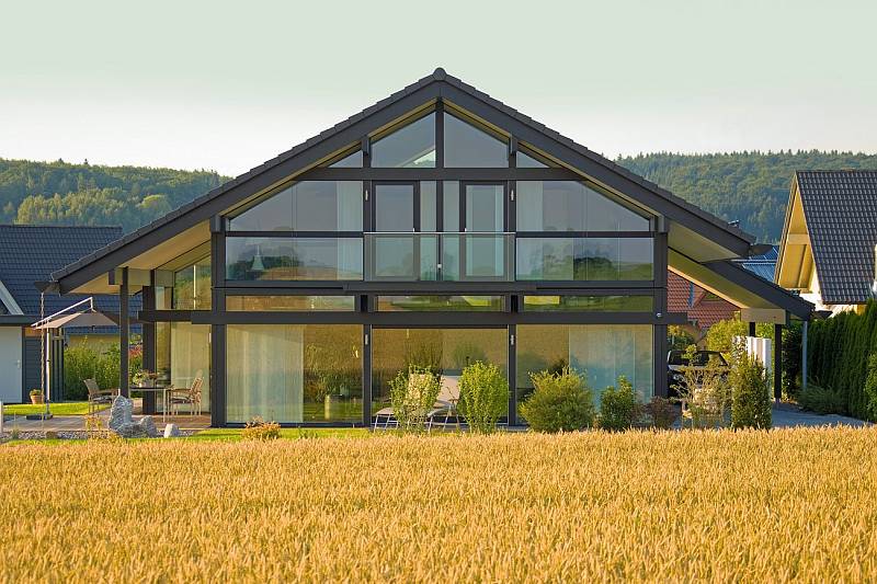 Obr.: Bohaté prosklení je typickým prvkem dřevostaveb z těžkého skeletu. Jinou možností výplní mezi jednotlivými nosnými prvky jsou sendvičové stěny s klasickou skladbou včetně izolace. Foto: Huf Haus