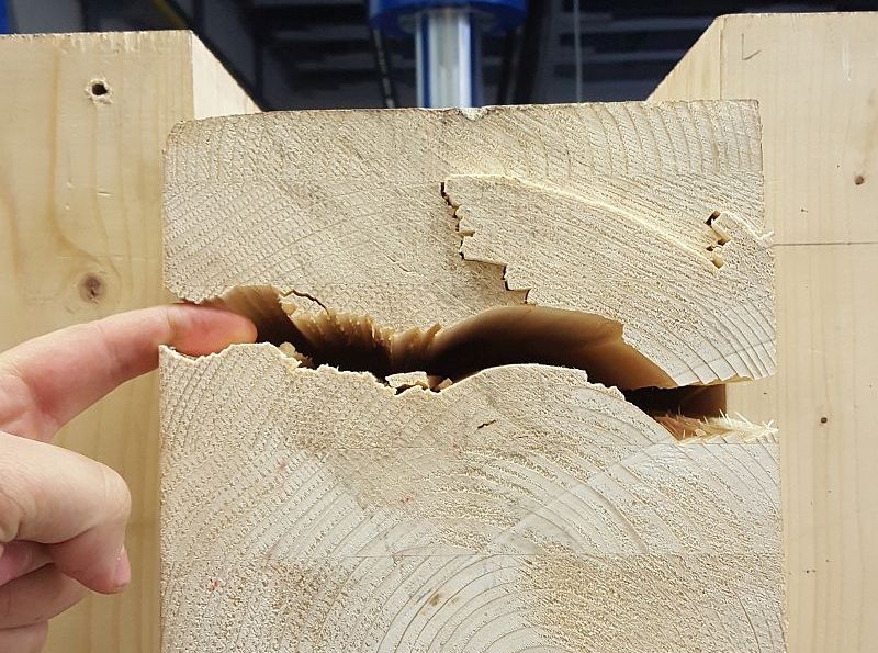 Tato vodorovná síla narůstala až do stadia, kdy tah kolmo na vlákna ve stojce způsobil tuto trhlinu. Navzdory vzniku trhliny test mohl dále probíhat, protože neměla významný vliv na únosnost zkoumaného spoje. Nakonec byl spoj zatěžován až do porušení.