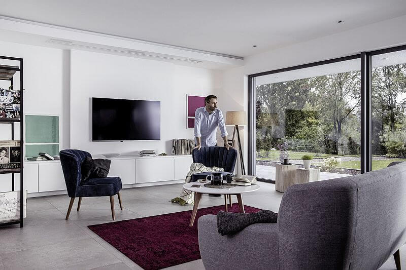V této souvislosti také často toužíme po co nejpřirozenějším kontaktu s okolím. Praktickým doplňkem jsou proto velkoformátové posuvné dveře, které kromě většího množství světla, jednoduše propojí obývací prostory s terasou. Takový komfort navíc přinese bydlení zcela jiný rozměr.