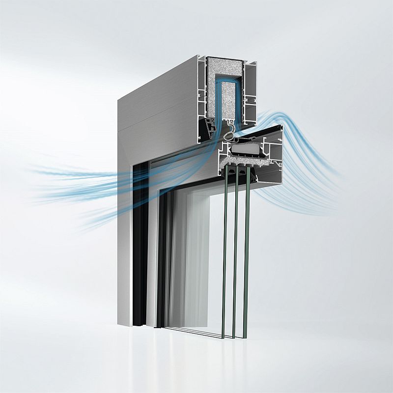 V pootevřené poloze je vzduch zvenčí přiváděn skrze ventilační kazety umístěné v horním rámu, čímž je zvuk rozptýlen a je zajištěna jeho výrazná redukce. Akustické okno Schüco AWS 90 AC.SI tak umožňuje dosáhnout zvukové izolace až 31 dB a zároveň přirozeně větrat.