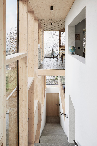 Architekt Jochen Specht přišel s nápaditým řešením: dům se obestaví dřevěnou konstrukcí, zvětší se tak jeho užitná plocha, a přesto zůstane ve své podstatě zachován. Jednoduchá myšlenka majitele nadchla. Původní dům byl zbaven veškerého vybavení včetně oken a dveří a uveden do stavu hrubé stavby. Dřevěná sloupková konstrukce, která dům „obklíčila" ze všech stran, vytvořila protipól původnímu zděnému jádru a přitom bylo možné využít všech výhod moderní dřevostavby: vysoký stupeň prefabrikace, rychlá montáž, příjemné interiérové klima a udržitelnost. Stávající krovová konstrukce zůstala zachována a byla protažena o 1,5 metru na okapové straně a o 4 metry na straně druhé.