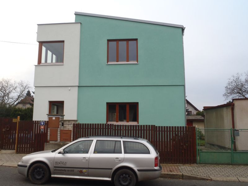 Tentokrát jsme pořizovali vnější přístavbu stávající zděného domu a zároveň nástavbu na stávající garáž rozšiřující prostory druhého podlaží. Pod přístavbou pak vniká průchozí prostor. I zde byla stavba výrazně omezena podmínkami parcely a rovněž pochopitelným požadavkem investora minimalizovat dopady stavby jednak na provoz vlastního domu (rekonstrukce a dostavba probíhaly za provozu), jednak na již založenou a pracně udržovanou zahradu.