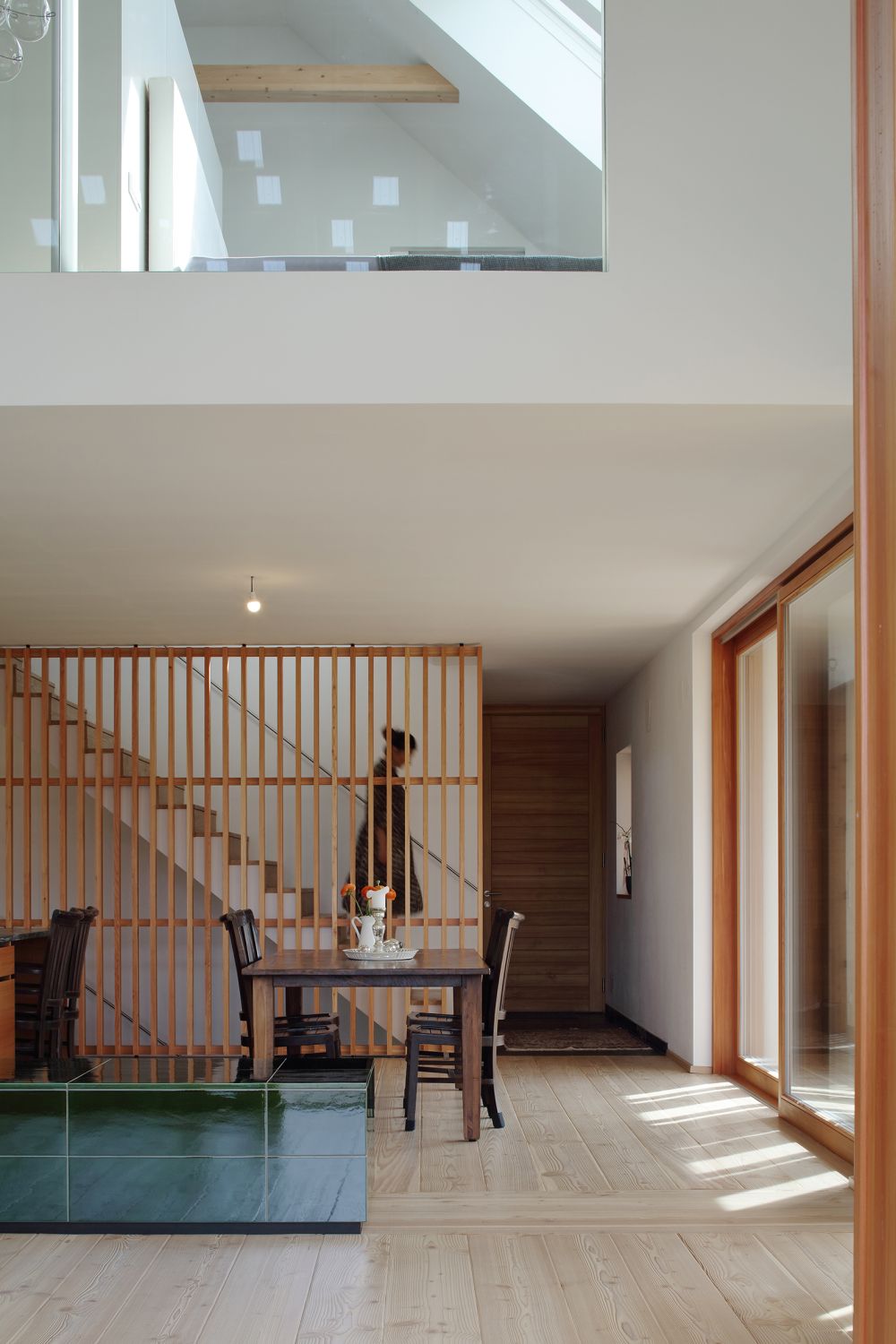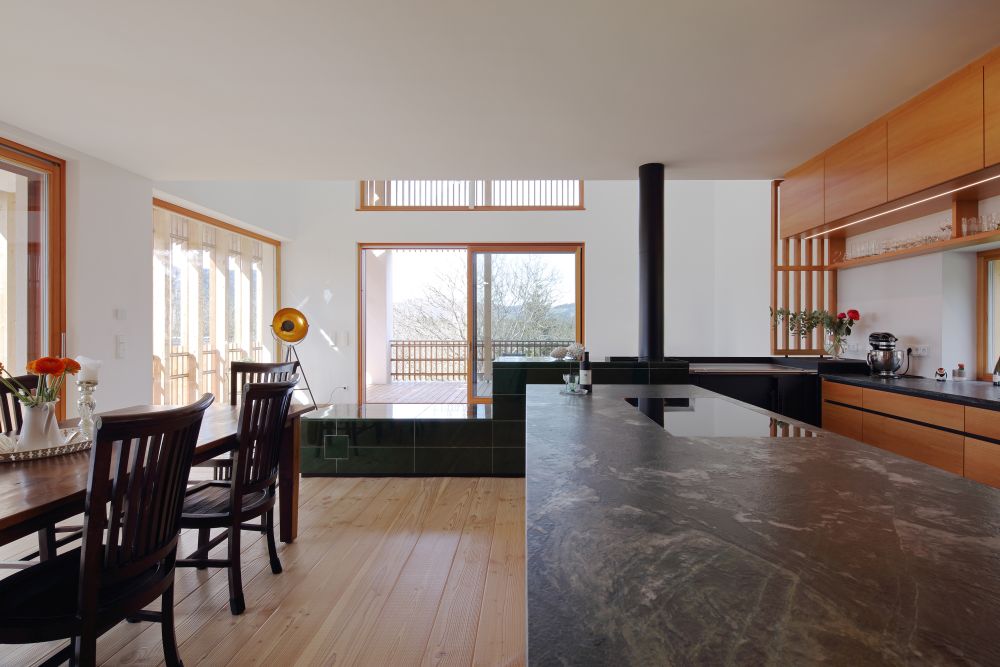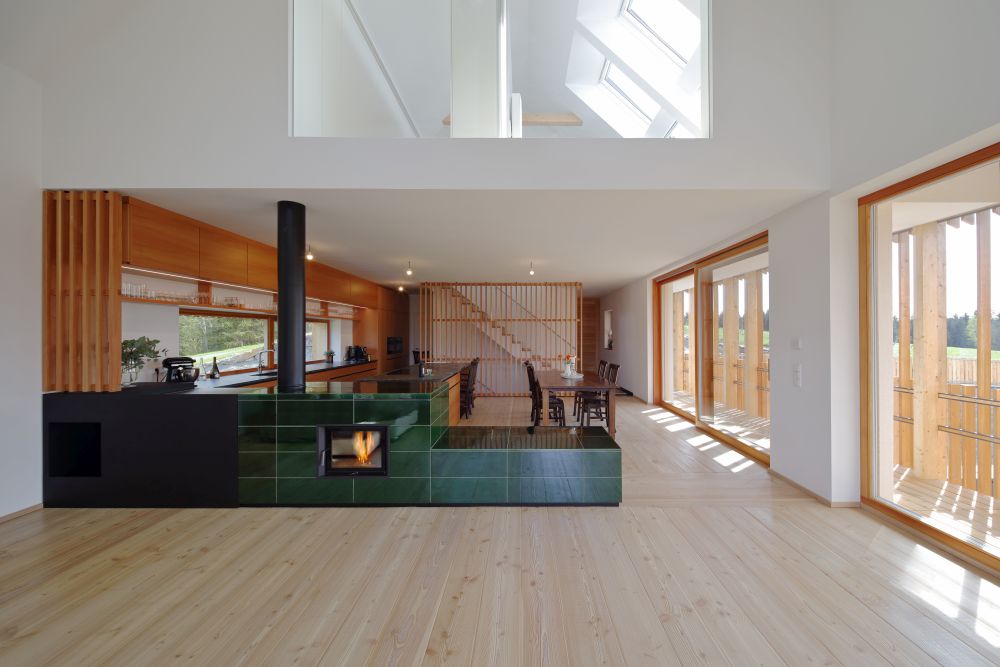 Uprostřed obývacího pokoje jsou téměř pět metrů dlouhá kachlová kamna tvořící předěl mezi obývacím pokojem, jídelním stolem a kuchyní. Na všechny silně povrchy v interiéru byla kromě modřínového dřeva použita zelená žula z bezprostředního okolí s různými povrchy od drsných po kartáčované. Některé z těchto materiálů vytvářejí vizuální spojení mezi interiérem a exteriérem.