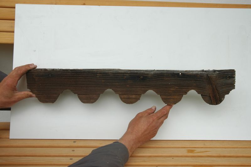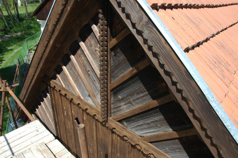 Podle poškozených zdobných prvků byly přesně vyrobeny nové. Veškeré nové prvky byly vykartáčovány a následně kvůli patinování v dílně opáleny. Teprve poté byl štít znovu sestaven. Patinování nových kusů dřeva zajistilo vizuální sjednocení celé lomenice, i když časem nové kusy přece jen trochu vybledly. Ale není třeba se bát: postupně se barevný rozdíl působením slunce a povětrnosti zcela srovná.