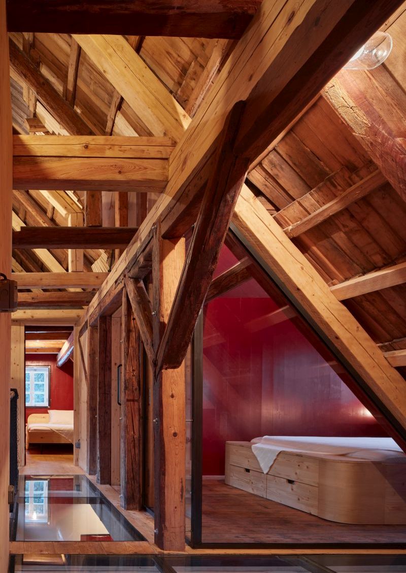 Subtilní ocelové schodiště s dřevěnými stupni je osvětlené velkým kulatým světlíkem. Část podlahy ve druhém patře nahradilo pochozí sklo, prosklené jsou i dveře a některé příčky. Díky tomu se celý vnitřní prostor propojil do jednoho celku s překvapujícími průhledy na fortelnou dřevěnou konstrukci krovu. Ve druhém patře jsou umístěné čtyři ložnice, velká dětská slouží zároveň i jako herna.