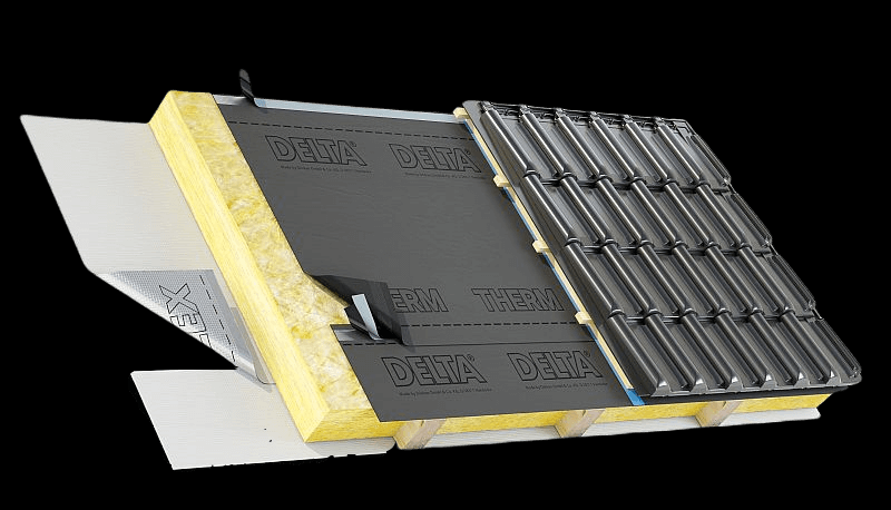 Hlavní hydroizolační vrstvu (tedy vodotěsnou) tvoří u této střechy právě skládaná krytina, umístěná na střešních latích. Pod krytinou najdeme onu větranou vzduchovou mezeru, ze spodní strany uzavřenou pojistnou hydroizolací. Ta doplňuje funkci vodotěsné krytiny, která přeci jen za určitých podmínek vodu dál pustí – nejčastěji ve formě navátého sněhu nebo při větrem hnaným deštěm. Tato hydroizolace musí být takzvaně difuzně propustná, tedy propustná pro průchod vodních par.