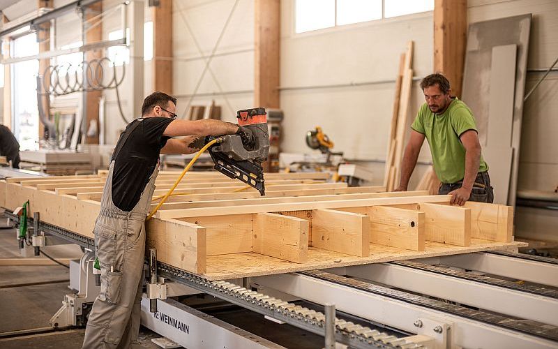 Nové výrobní zařízení WEINMANN zahrnuje klasický systém s otáčecím tesařským stolem a multifunkčním mostem WALLTEQ M-380, před který je doplněn čtvrtý stůl pro skládání rámů. Tato konstelace je jedním z několika přizpůsobení systému konkrétním potřebám zákazníka: Jelikož je na otáčecím stole také montována instalační předstěna s chránícími trubkami a následným vnitřním opláštěním, umožňuje využít první stůl pro optimalizaci výrobního toku a zvýšení kapacity systému.