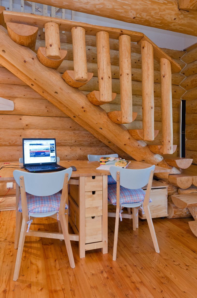 Žijeme tady ve výšce 500 metrů nad mořem, často silně fouká vítr, letos jsme zažili mínus 28 stupňů, přesto jsme zimu uvnitř nepocítili. Trochu víc jsme museli topit, než jsme srub po třech letech vyspárovali, ale nijak výrazně. Máme ústřední topení s elektrickým kotlem, v přízemí jsou dva radiátory a v podkroví je radiátor v každé místnosti. Elektrické topení ale využíváme jen, když nejsme doma, nebo po ránu, abychom nevstávali do vychladlého bytu. Po většinu roku nám na vytápění vystačí krbová vložka. Spotřebu dřeva máme minimální – tak čtyři až pět kubíků za zimu. Srub je malý a dřevo je výborný izolant.