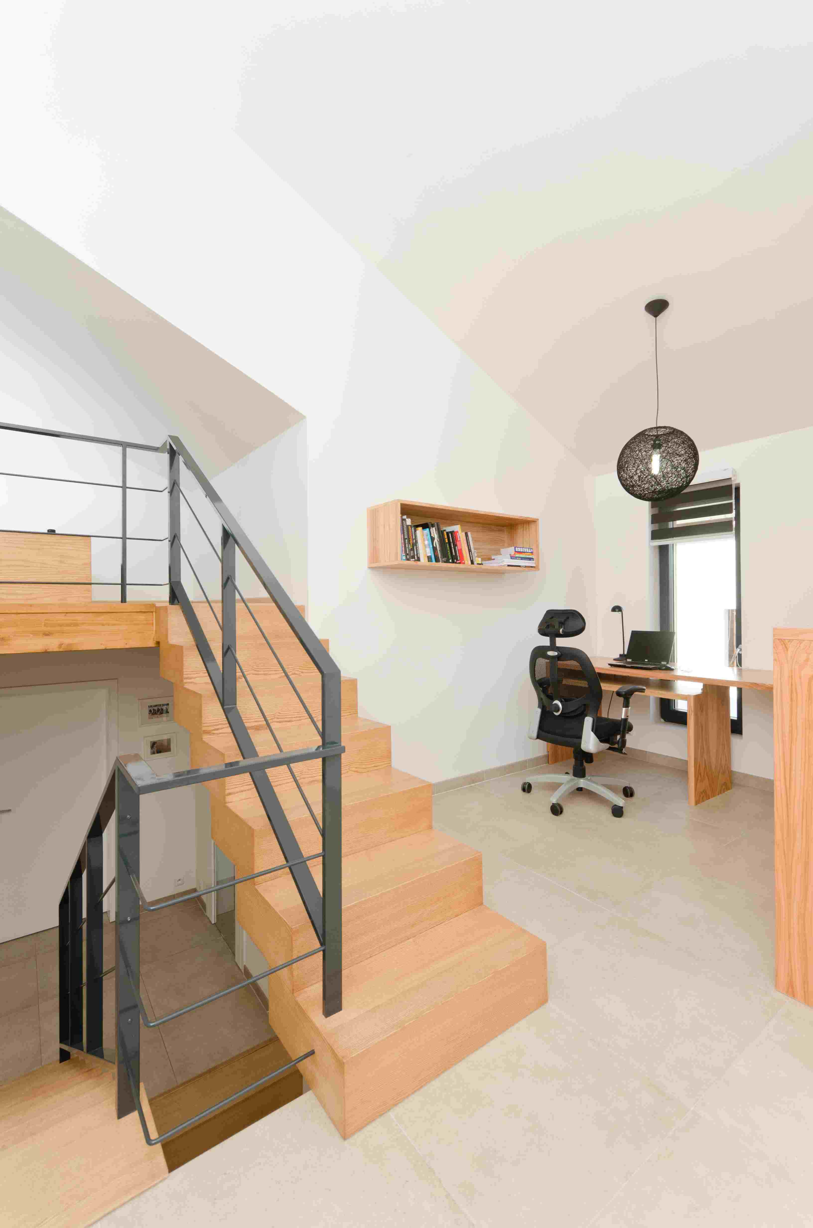 Náš pozemek je vlastně prolukou mezi starší zástavbou, mírně se svažuje k jihu a na jeho jižní okraj navazuje velký rybník. Stával tady starý domek, ale byl v hodně špatném stavu a jeho demolice byla jediným rozumným řešením. Podle projektu se zhotovily jednotlivé panely, z nichž se dům pomocí jeřábu poskládal. Mezitím se mohl upravovat terén. Dům byl vymyšlen tak, že bude vycházet z tvaru pozemku a co nejvíce se mu přizpůsobí. Vznikla tak vlastně čtyři podlaží – na úrovni vstupu do domu se nachází koupelna a pokoj starší dcery, která už s námi nebydlí, ale má kam jezdit na víkendy a zároveň slouží i jako pokoj pro hosty, obytná část je o podlaží níže, naopak po schodech nahoru se dostaneme do ložnice, dětského pokoje a pracovny a úplně nejvýš je malý odpočívací koutek. Ten tu původně vůbec neměl být, v předsíni měly být trámy a nad nimi jen otevřený prostor. V průběhu stavby jsme se rozhodli, že ten maličký prostor využijeme na patro na spaní, kdyby přijelo víc hostů, a nechali jsme k němu udělat rovnou i stejné schody jako dole. Vypadá to, že celý den jen běháme po schodech, ale vůbec nám taková dispozice nevadí. Naopak – díky otevřenému schodišti jsme všichni stále pohromadě a přitom každý může být o samotě, pokud zrovna potřebuje. Hrubá stavba domu trvala jen několik dní, dokončovací práce a zejména zařizování interiéru se ale protáhly na spoustu měsíců – přiznávám, že i proto, že jsem detailistka. Nemám úplně vyhraněný styl, v zařizování jsem šla pocitově a snažila jsem se ladit maličkosti a to mi dalo asi nejvíc práce. To ale zná asi každý, kdo někdy zařizoval vlastní bydlení – vybrat nábytek, osvětlení nebo třeba dvířka kuchyňské linky je často obtížnější než se rozhodnout pro konkrétní typ domu.