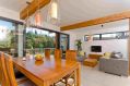 Ačkoliv velkoformátové dřevěné panely umožňují ponechat v interiéru plochy v pohledové kvalitě, my jsme se rozhodli opláštit je sádrovláknitými deskami Fermacell. Podle mě by dřevo hodně určovalo styl interiéru a těžko by se vybíral nábytek, který by s ním nějakým způsobem ladil nebo naopak kontrastoval. Dřevu v interiéru jsme proto dali přednost jako materiálu pro nábytek, schodiště nebo podlahy v pokojích. Podlaha v obytné části, kde je dnesn dlažba, měla být původně stěrkovaná bez klasické krytiny, ale ukázalo se, že stěrka je sice velmi módní a pohledově příjemná, ale je citlivá na povrchové poškození – a to byl s naším hyperaktivním psem a nově také dvěma kočkami asi problém. Také jsem si nedokázala moc představit, že bych se při pobíhání mezi kuchyní, zahradou a terasou musela vždycky zouvat jen proto, abych nepoškrábala podlahu. Podařilo se mi narazit na velmi šikovné truhláře a i když mají sídlo až na střední Moravě, nakonec jsem jim svěřila výrobu veškerého nábytku. Ten se kuriózně přizpůsoboval poctivému dřevěnému jídelnímu stolu, který jsme si koupili ještě před nastěhováním. Od jeho dezénu se odvíjel vzhled dvířek kuchyňské linky, obývacího pokoje i povrchová úprava pohledových stropních trámů. Ačkoliv to nebylo vždy jednoduché, nakonec vytvářejí všechny dřevěné prvky zdání, jako by byly z jedné série a to jsem si přála.