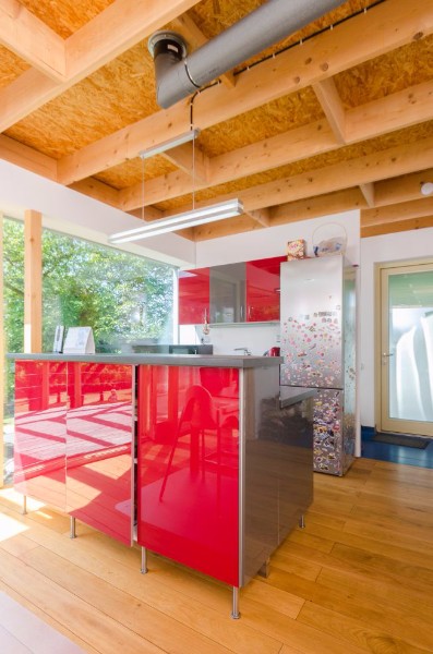 Výsledkem je kompaktní objekt s plochou střechou. Výška domu je o něco větší tak, aby v pokojích vznikl prostor pro malé mezipatro na spaní. To je v případě tak minimálního domu cenné místo navíc. Metry čtvereční šetří také důmyslná dispozice bez chodeb – do místností podél severní strany objektu se vchází přímo z hlavního obytného prostoru. Jako víkendové zázemí takový domek stačí celé rozvětvené rodině.