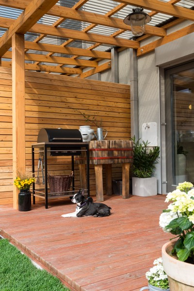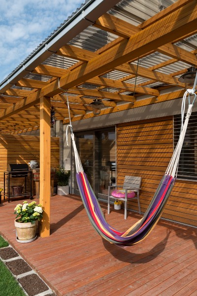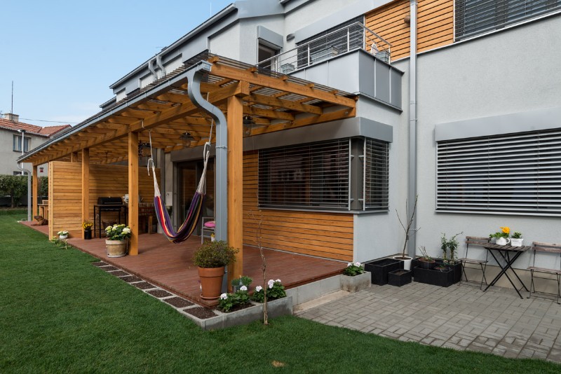 Obývací část je orientovaná na jih a navazuje přímo na terasu. Venku trávíme většinu roku a dveře i okna zůstávají málokdy zavřená. Přepážka mezi terasami krásně zajišťuje soukromí, zanedlouho přibude také plot oddělující jednotlivé zahrady. Parcela není velká, ale když jsme objednávali trávník a zadávali číslo 120 metrů čtverečních jen pro naši část zahrady, uvědomili jsme si, že to není vůbec špatné a celý projekt dopadl nad naše očekávání.