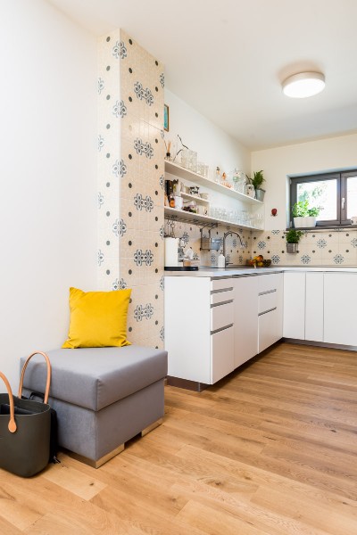 Dali jsme si záležet s výběrem zařízení, které je složeno převážně z originálních kousků vyrobených na míru, často českého původu, nebo získaných v bazarech. Jídelní stůl má například desku z teakové podlahy, obklady v koupelně a kuchyni jsou původem ze Španělska, nadšeni jsme také ze sedací soupravy na míru s velkými úložnými prostory a malou knihovnou.