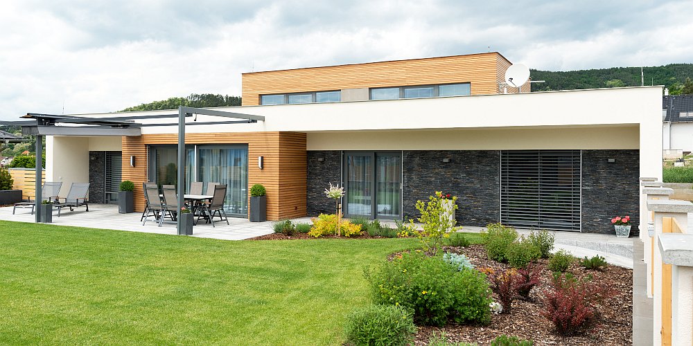 obr.: Díky platformě je dům posazen vysoko a má krásný výhled do krajiny Berounska. Tentokrát majitelé zvolili přízemní variantu dřevostavby. Každý pokoj tak má přímý kontakt se zahradou a okolní přírodou. Foto: Martin Zeman