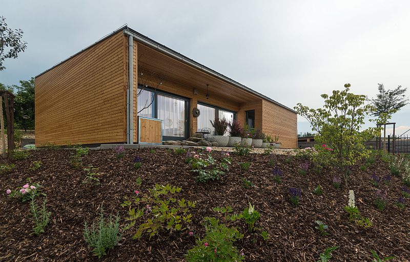 obr.: Fasáda z modřínového dřeva je ošetřena lazurovacím olejem. Obnova nátěru je sice potřeba až po několika letech, pokud však natírání majitele přestane bavit, fasádu zkrátka nechají přirozeně zešednout. Foto: Martin Zeman