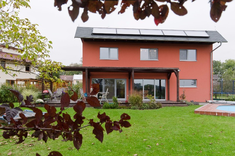 Dům s cihlově červenou fasádou měl být původně z jiného materiálu, avšak majitelka postupem času přišla na nesporné výhody dřevostaveb. Dnes po šesti letech aktivního obývání je za své důležité rozhodnutí velmi ráda a s domem, který má na své zahradě vzrostlý ořech, je nadmíru spokojená.