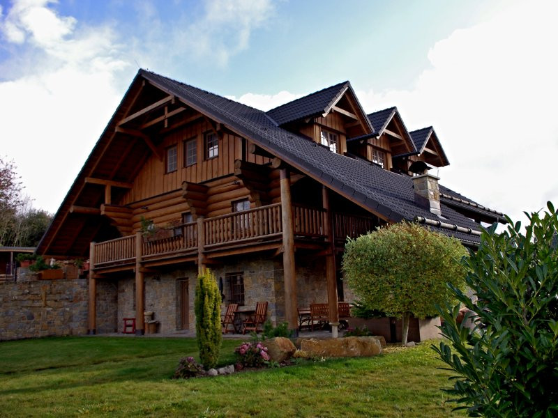 „Postupem času jsme chtěli v tomto regionu další penzion a koupili jsme tady v sousedství nedostavěný hotel. Ovšem abychom ho mohli opravit, museli jsme se sem přestěhovat a protože byl čirou náhodou k mání i sousední pozemek, naskytla se možnost vybudovat dům pro správce rekreačního zařízení. A to už byl srub jasná volba. O roubence jsme neuvažovali, roubenky mají své historicky dané lokality a v tomto regionu se nestavěly. Sruby zde pak nejsou původní vůbec, a pokud měla být naše stavba netypická, musel to být výjimečný a pro tuto lokalitu nezvyklý srub. V našem okolí není jiná stavba, proto nebyl žádný problém ani s úřady." Postupně přibyl ještě apartmánový srub pro hosty, další budovy a také dva tenisové kurty.