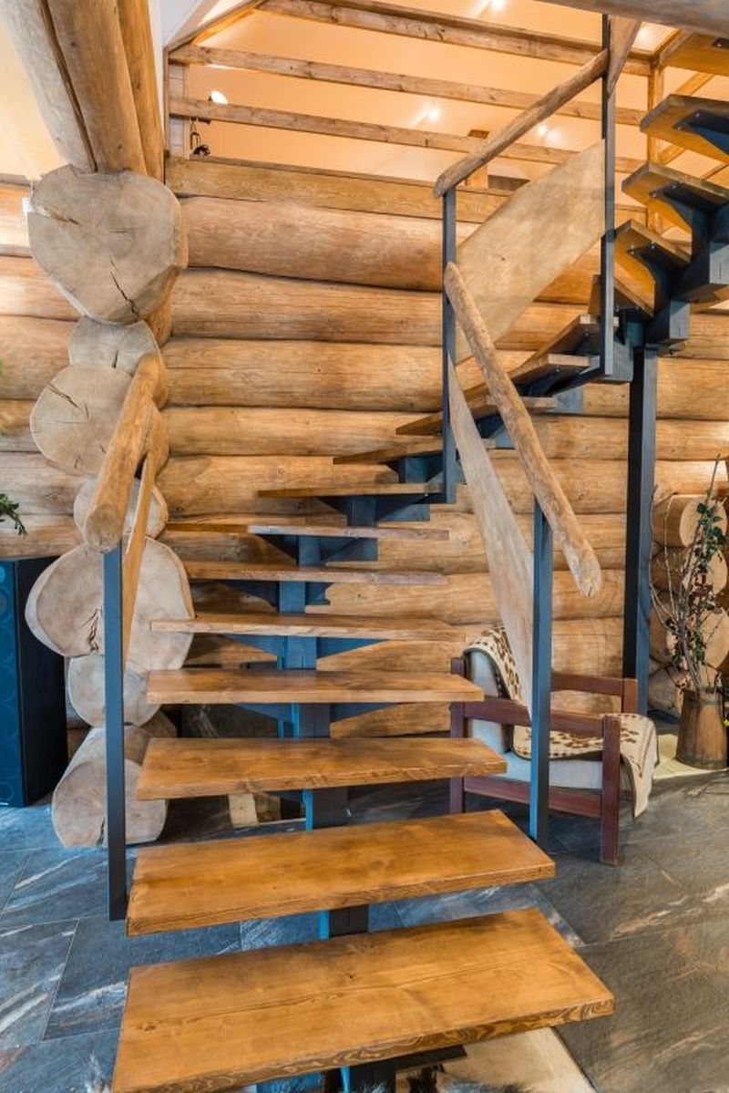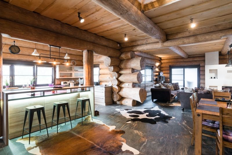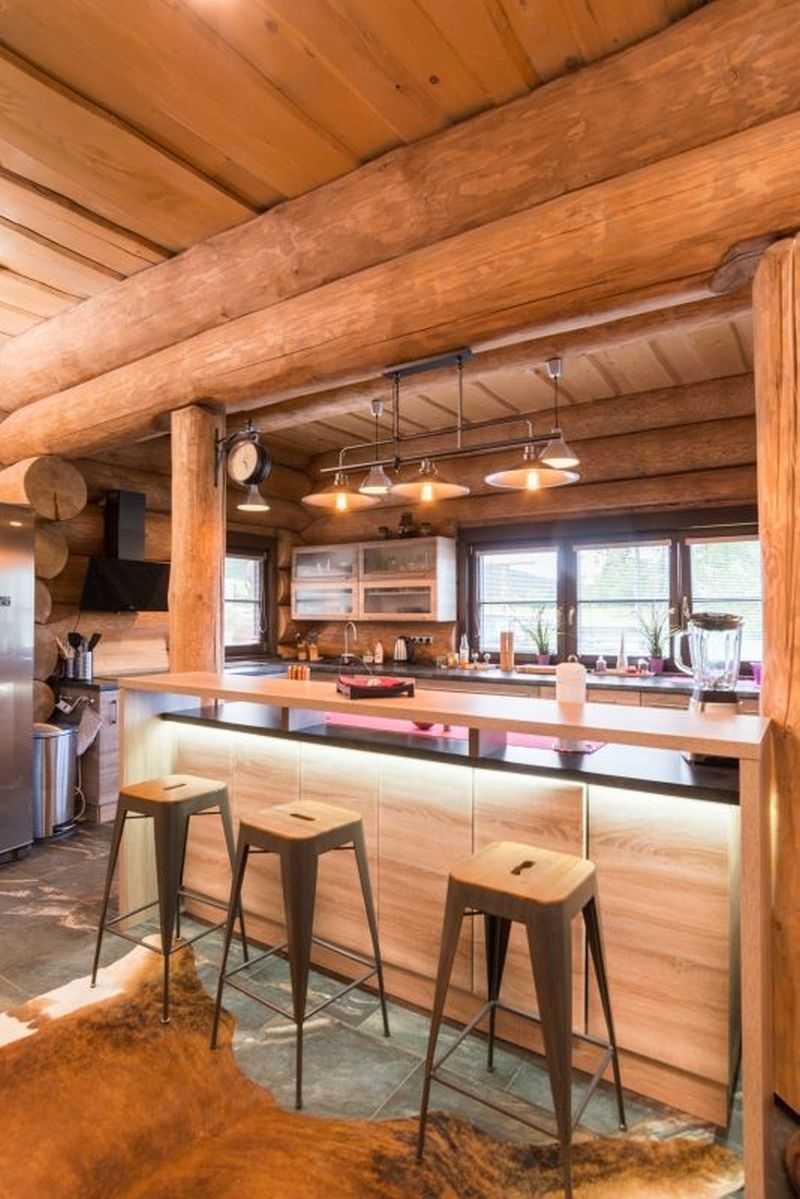 Masivní kulatina demonstruje texturu i charakter přirozenosti přírodního materiálu a přitahuje pozornost k surové dřevěné kráse.