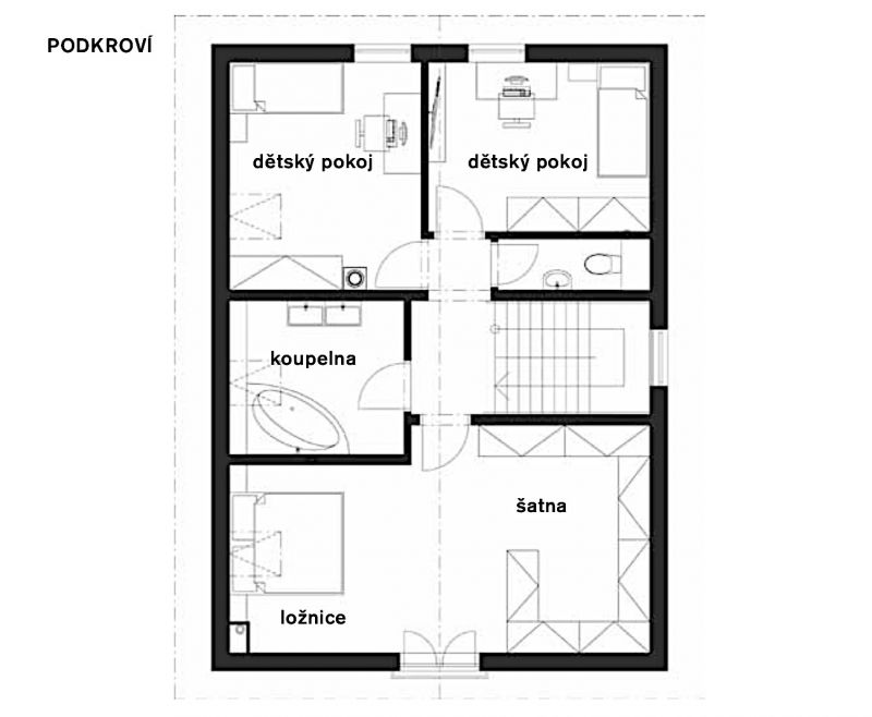 Také jsme tu nechali pohledový krov. Prostor je tak otevřený až do střechy na úkor části půdy, ale ložnici to dodává na působivosti. Dále šlo o drobnější úpravy jako například narovnání příček mezi dětskými pokoji, které původně byly do tvaru Z, vytvoření spíže pod schodištěm proti kuchyni nebo jsme přidali malé okno nad schodiště, takže je teď dobře osvětlené.