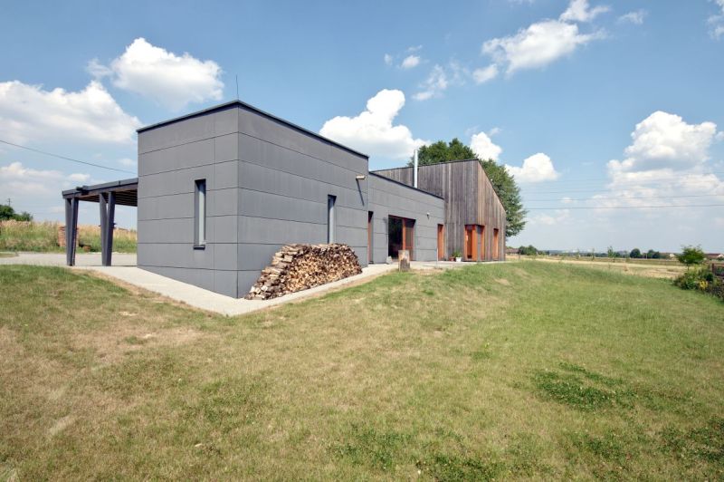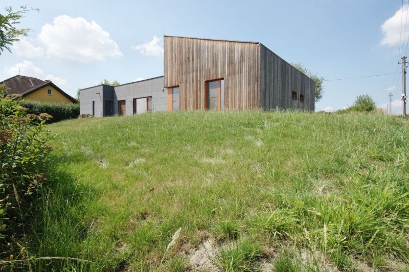Dřevostavba je postavena v severovýchodní části rohové parcely, která sousedí s místní křižovatkou. Směrem k ulici je tedy situováno zastřešené stání pro dvě auta v přímé návaznosti ke vstupu a zázemí domu na straně severní. Západní a severní fasáda je pro zachování maximálního soukromí osazena pouze minimalistickými pásovými okny a obytné místnosti nasměroval architekt na jih k otevřené zahradě a slunci. Díky bezparapetním oknům jsou zajištěné i plnohodnotné solární zisky. Jaromír bydlí v dřevostavbě s rodinou už skoro deset let. Po životě v bytě se jim prý vůbec nestýská.