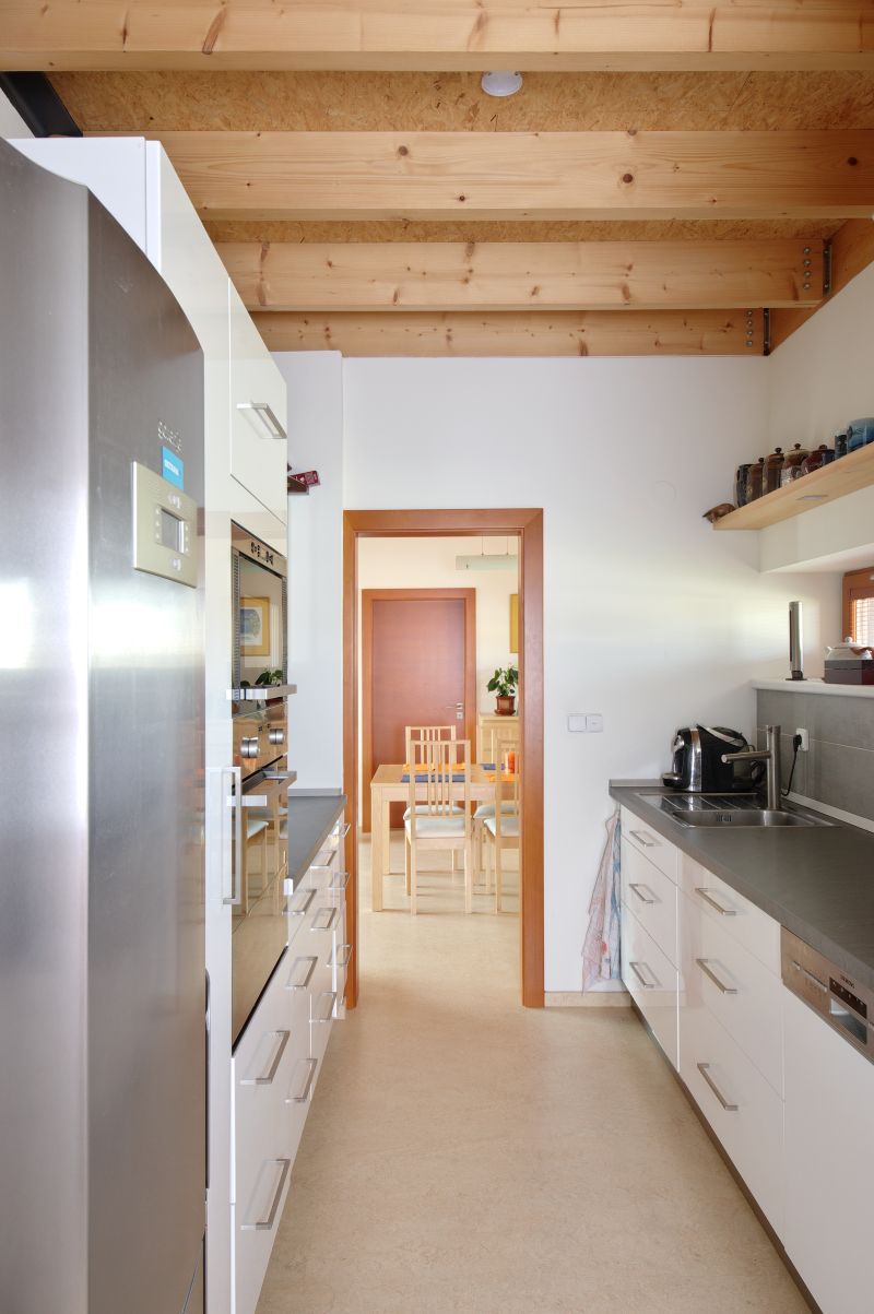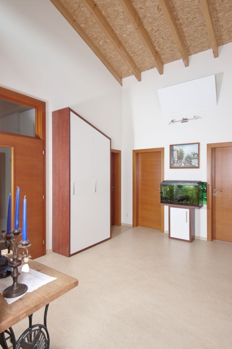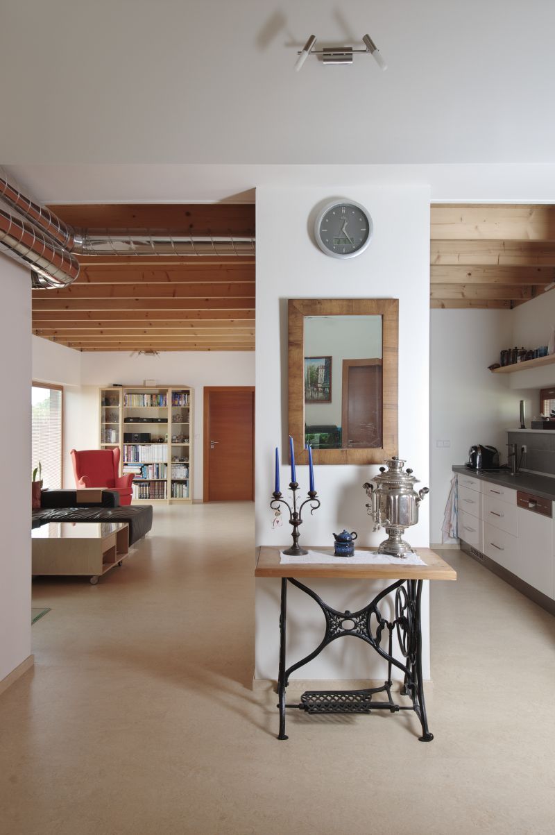Ano, minimalizovaly se interiérové dveře. Jsme tak stále pospolu a všichni jsme součástí všeho, co se v domě děje. K atmosféře otevřenosti nejvíce přispívají velká francouzská okna, která jsou dále i ve všech pokojích vedoucích na terasu s výhledem do zahrady. Ta je tak přímou součástí domu a tím, že jsme záměrně výhled nezakryli žádnými záclonami nebo závěsy, máme v domě stále živé obrazy, které se mění v závislosti na ročním období a počasí. Dalším spolutvůrcem velmi příjemné atmosféry se od podzimu do jara stávají krbová kamna s většími prosklenými dvířky, která do dřevostavby přinášejí kromě tepla i příjemný pohled do plápolajícího ohně.