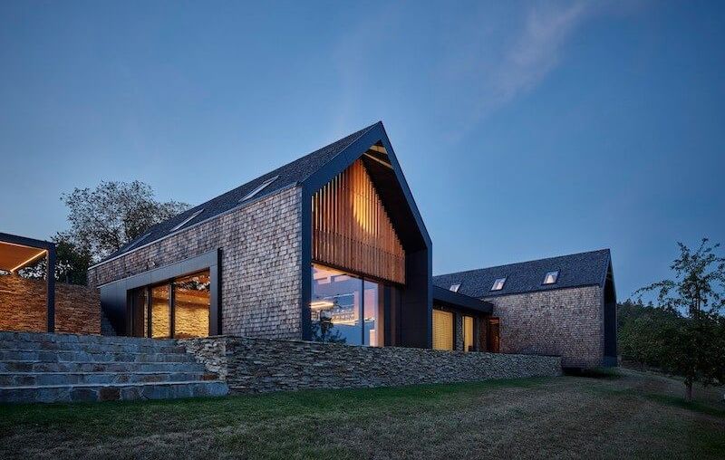 Koncept: Rodinná usedlost je z větší poloviny tvořena železobetonovým monolitem zapuštěným pod zem, s pochozí vegetační střechou, a v druhé části doplněna těžkým dřevěným skeletem otevřeným do krovu. Prosklené čelní stěny chaletů i obytných místností mezi nimi jsou orientovány na jihovýchod a nabízejí jedinečný výhled do sadu a krajiny. Štítové laťování pak poskytuje přirozené mimikry pro pohledy zvenčí a téměř srůstá s šindelovou střechou a opláštěním domu. Foto: Vladimír Novotný, KIVA