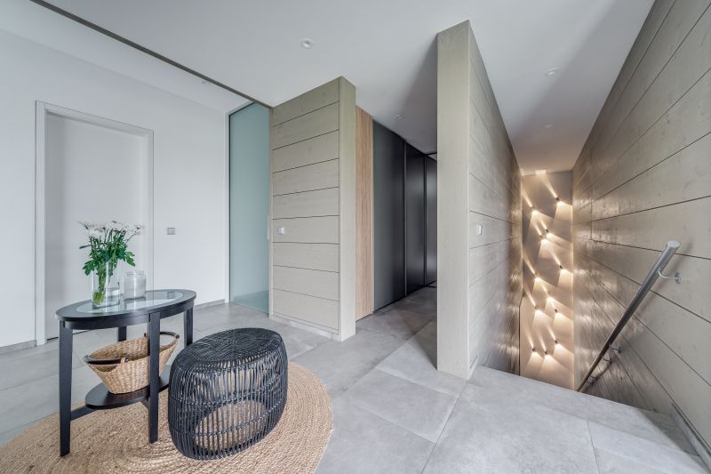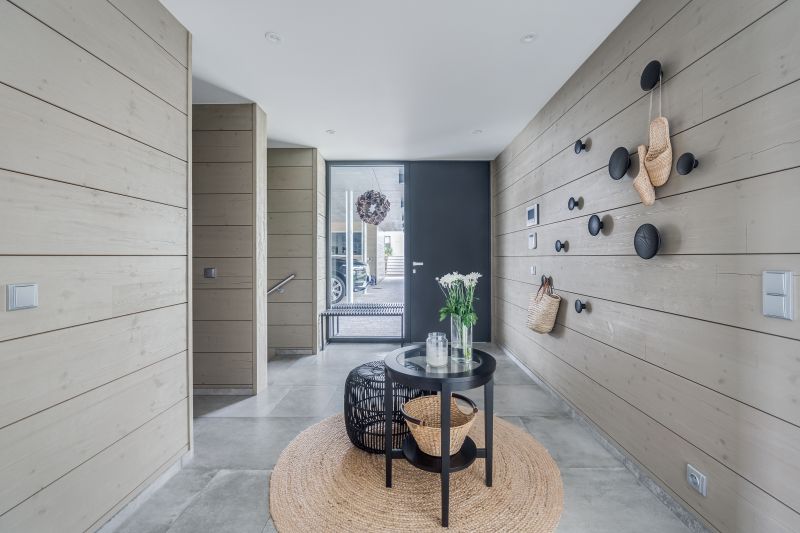 Pěší přístup k domu je zastřešený a je součástí objektu parkovacích stání, která na něj navazují. Podzemní podlaží není z ulice vidět. Nad terén vystupuje pouze její severovýchodní část. Ta je potažena betonovou omítkou. K dřevěné nadzemní části domu přiléhá objekt skladu a zastřešených stání. V těchto místech je střecha plochá a fasáda je opláštěna cementovláknitými deskami v antracitové barvě.
