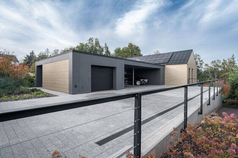 Klíčem k vyřešení problému, tedy posunutí obytné části domu dále od komunikace a zvětšení zahrady, byl další z požadavků investora, a to vytvoření tří zastřešených stání a umístění skladu na sportovní vybavení a zahradní techniku. Ty jsme orientovali kolmo k domu. Tím jsme mohli dům posunout dále od uliční čáry a současně oddělit příjezd k domu od zahrady.