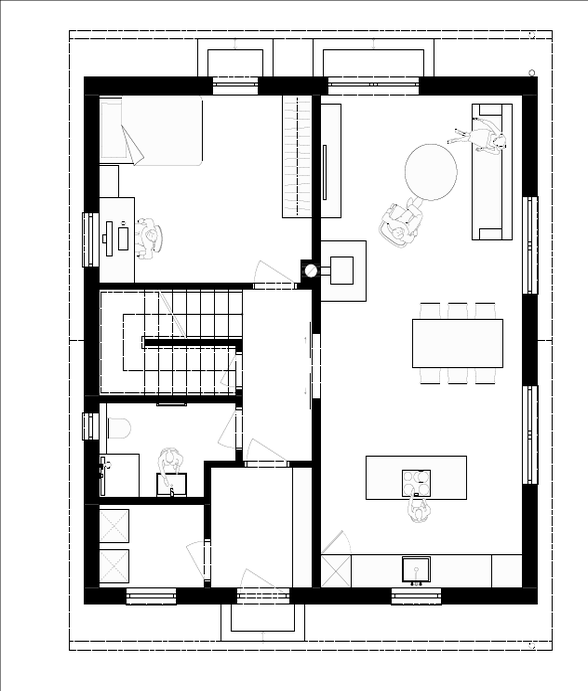 Dispozice: Na počátku věděli majitelé, že budou chtít velkou obytnou místnost, pracovnu a skládek v přízemí, do patra směřovali dětské pokoje a ložnici. Tento požadavek téměř doslova splňoval jeden z katalogových projektů dodavatele stavby. Foto: Martin Zeman