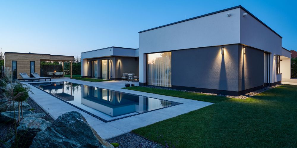Naše původní představa byla dost odlišná od architektem navržené a jsem rád, že nás přesvědčil o některých změnách. Hodně oceňujeme výšku stropu tři metry v hlavním obytném prostoru. Celkově místnost působí o dost vzdušnějším dojmem. Prostor podle mého také pozvedá velký mechový obraz 2,5 × 1,5 metru, který jsem chtěl od začátku. Skvělou věcí jsou velké prosklené plochy z chodby a obýváku směrem k bazénu. Jako výrobce bazénů jsem považoval za důležité, aby byl perfektně viditelný pro všechny příchozí. V létě se návštěvy většinou odehrávají rovnou na obrovské terase u bazénu nebo v altánu u zahradního domku.