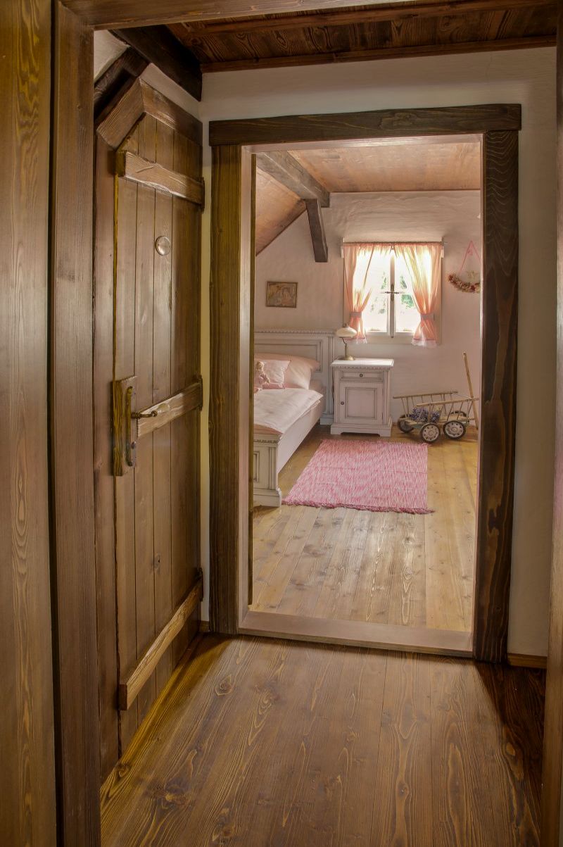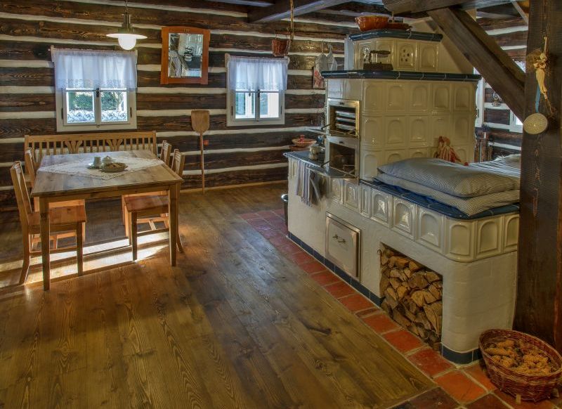 - Podlahy: dřevěné z drásaných palubek, cihelné z půdovek a keramické dlaždice