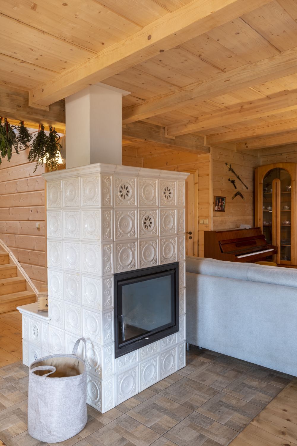 O vytápění v této roubence se starají kachlová kamna firmy RETAP s teplovodní vložkou z ručně vyráběných kachlí vzoru kopretina, glazura slonová kost.