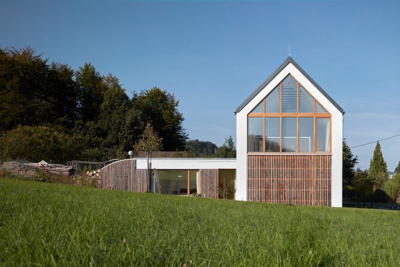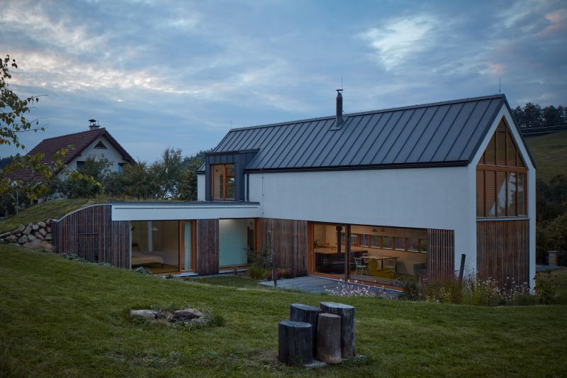 Stavebníci své potřeby soustředili na soulad privátních a pracovních prostor, maximum prosvětlení a energeticky velmi nízkou náročnost. Návrh byl tedy oříškem, v němž zásadní roli hrálo usazení domu do terénu a návaznost lidského sídla na přilehlou „divokost" krajiny. Delikátní výsledek vyšel z toho nejlepšího od každého prvku. Ze stávající výstavby si architekti vzali urbanistické uspořádání, zejména uliční linii. Z louky zase jemné křivky terénu, které natáhli až na střechu křídla s ložnicí, aby setřeli hranici mezi terénem a domem.