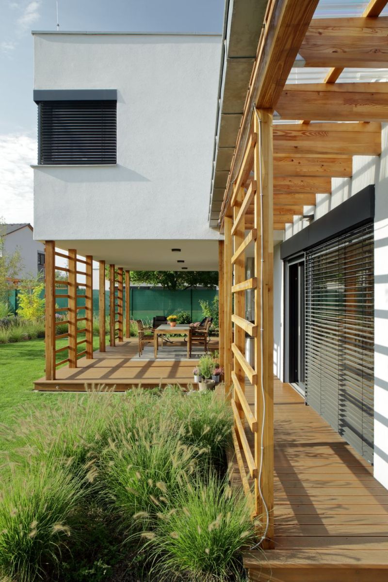 Silnou stránkou je kvalitně nastavené dispoziční řešení s návaznostmi na okolí domu, přístřešky a především na kryté sezení pod převisem druhého patra. Estetiku 30. let, kterou klienti chtěli uplatnit, zde aplikujeme v drobných detailech kulatých oken a oblého rohu v obytné místnosti.
