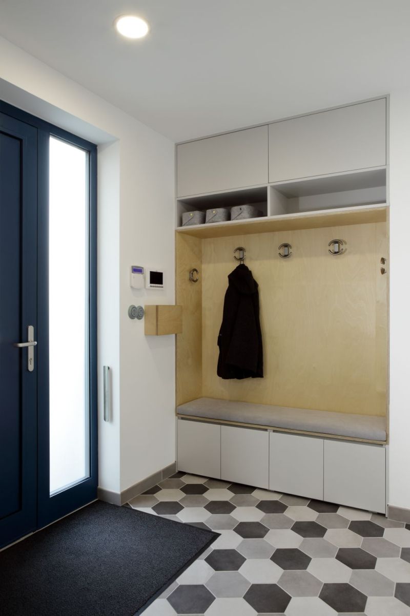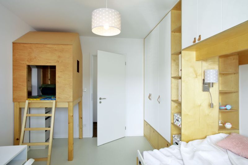 Zajímavostí je například skrytý shoz na prádlo integrovaný do nábytku pod umyvadly ve druhém patře, kdy prádlo padá přímo nad pračku do technické místnosti. Další vychytávkou je propojení pokojíčků příčkou skrz domeček. Pohledová železobetonová stěna v přízemí je akumulační objekt a zároveň výrazná dominanta obytného podlaží.