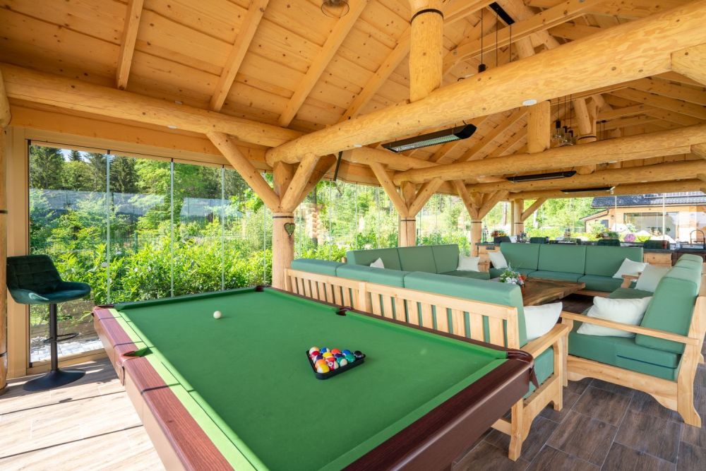 Venkovní altán je díky zasklívacímu systému možné ze všech stran otevřít. Vzhledem k tomu, že v něm majitelé společně s přáteli tráví v letním období nejvíce času, najdeme v něm kromě plnohodnotné kuchyně s grilem i kulečník a televizi.
